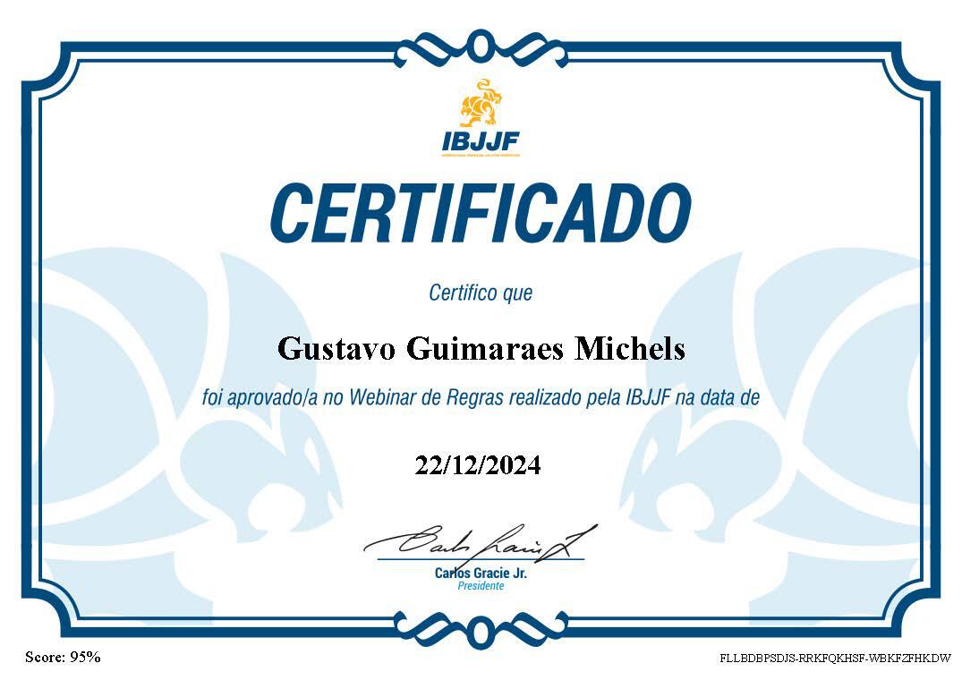 Brasilianer, geboren in der Stadt Petrópolis, am 18.08.1983 im Bundesstaat Rio de Janeiro. Mit Brazilian Jiu-Jitsu begann Gustavo "Brinquinho" im Jahre 2000. Ein Freund lud ihn ein, am Unterricht von Professor Vanderlei Mariano (Schwarzgurt) vom Equipe Team Crézio, in der Altstadt von Petrópolis, teilzunehmen.